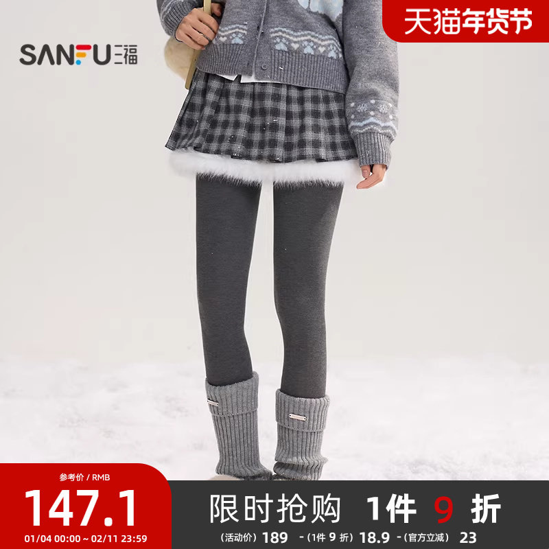 三福半身裙2025新款冬季英文刺绣毛绒摆A字格子短裙子女装512053