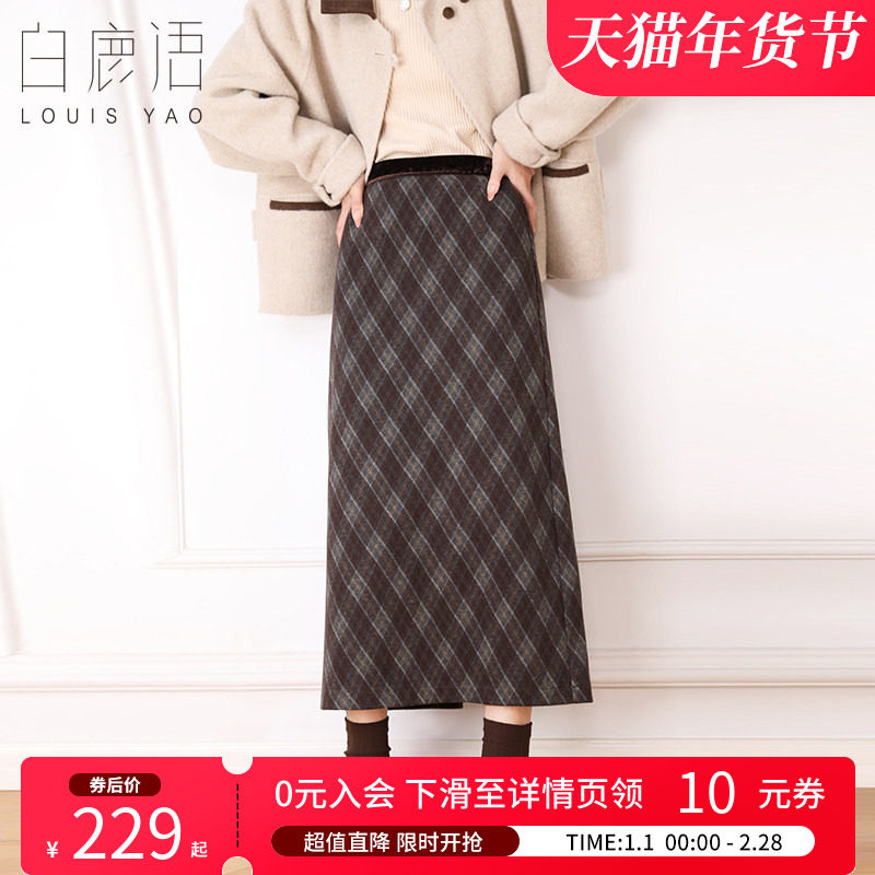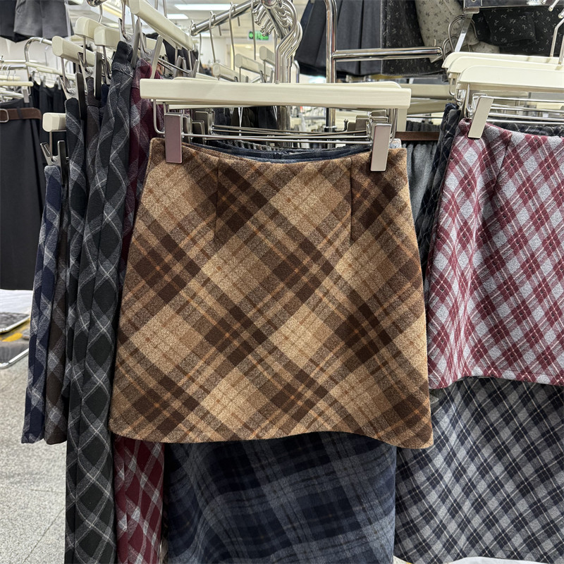 复古咖啡色格纹半身裙女士秋冬款高腰减龄气质防走光a字毛呢短裙