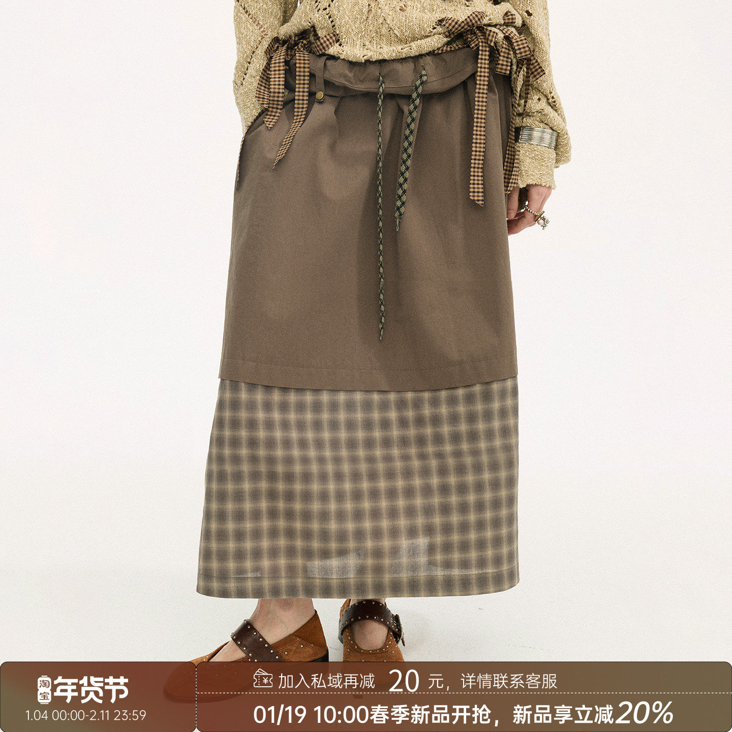 DIDDI MODA秋冬款翻腰头格纹拼接中长款女士半身裙有设计感裙子