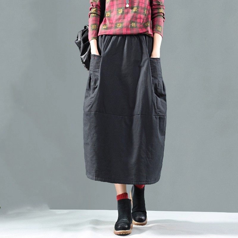 女士复古国风半身裙春秋冬款宽松百搭显瘦松紧腰加厚保暖夹棉裙子