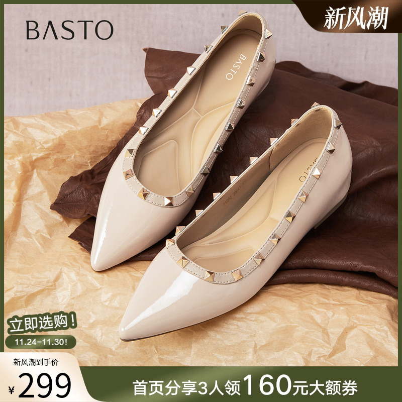 低跟铆钉单鞋女粗跟尖头裸色柳丁平底鞋2025春秋新款漆皮包头凉鞋