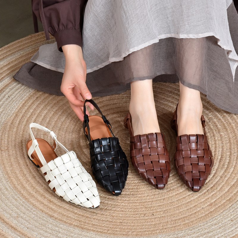 夏季新品头层牛皮手工复古编织套脚凉拖鞋韩版包头尖头低跟女单鞋