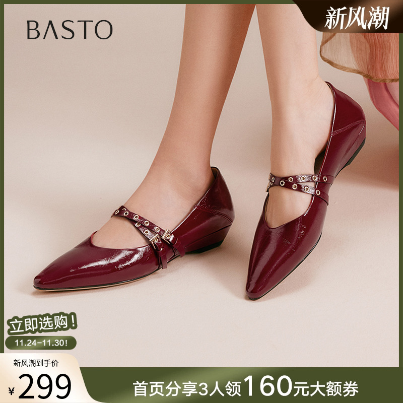 百思图2025秋季新款玛丽珍鞋法式尖头低跟红色浅口女单鞋A3191CQ5