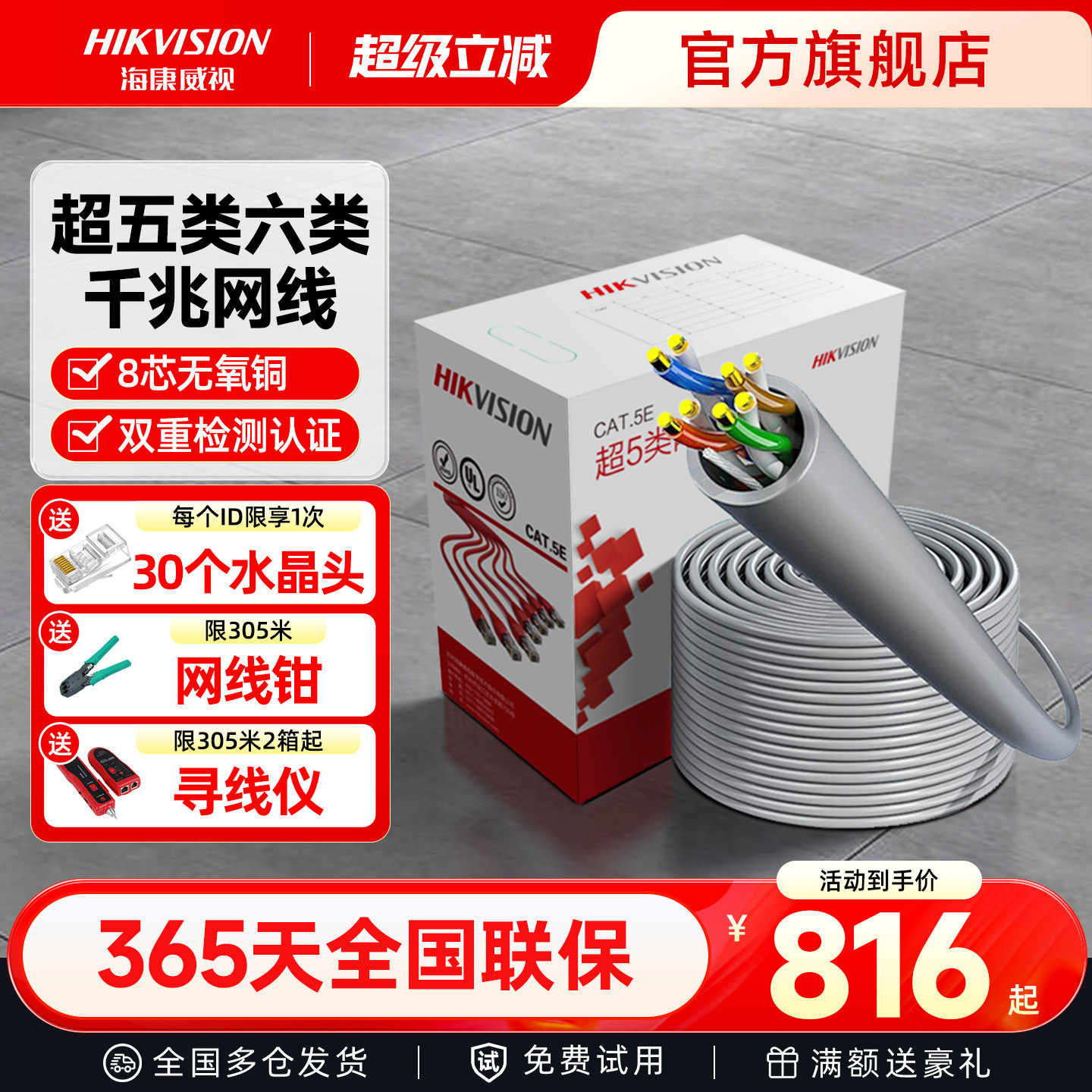 海康威视超五类网线企业室内无氧铜电脑宽带监控网络线305米一箱