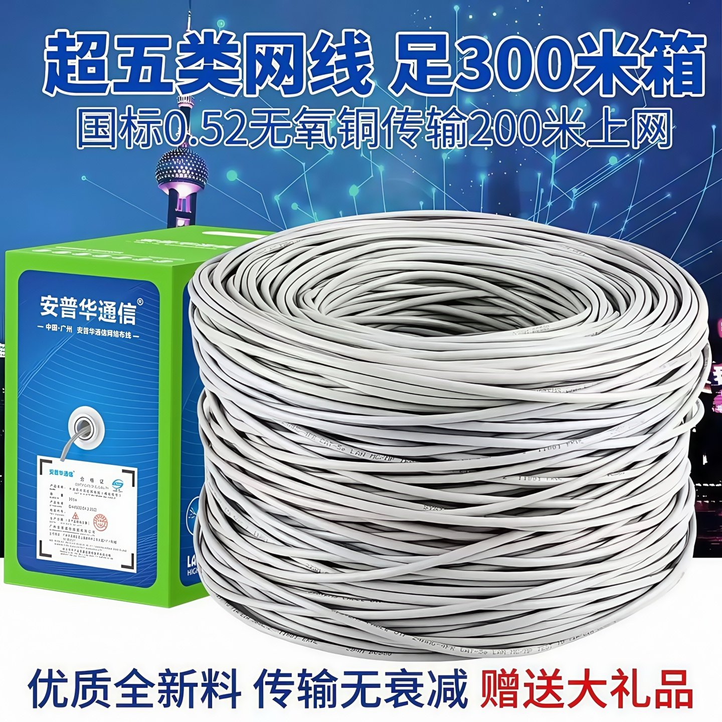 安普华通信超五类网线千兆纯铜电脑监控线5类无氧铜家用网线300米