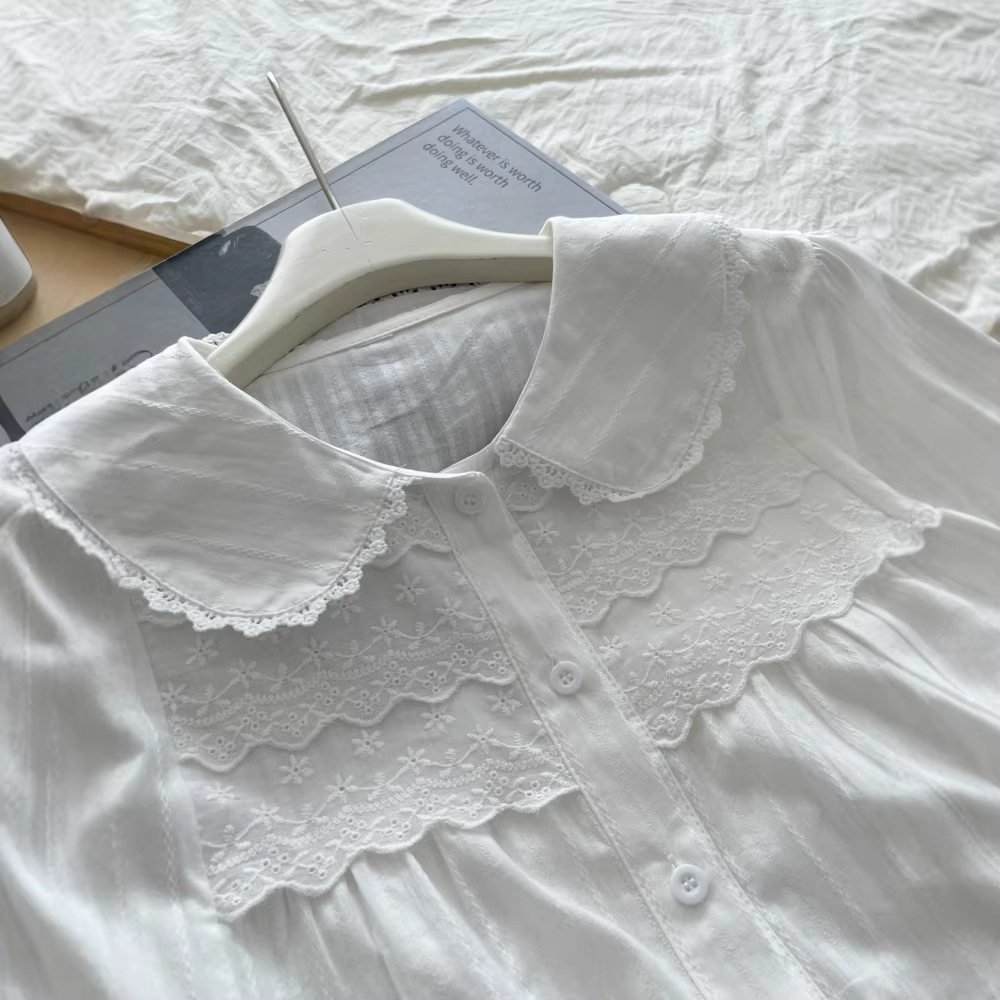 2025春文艺小清新甜美蕾丝彩扣刺绣花朵娃娃领白衬衫女长袖打底衫