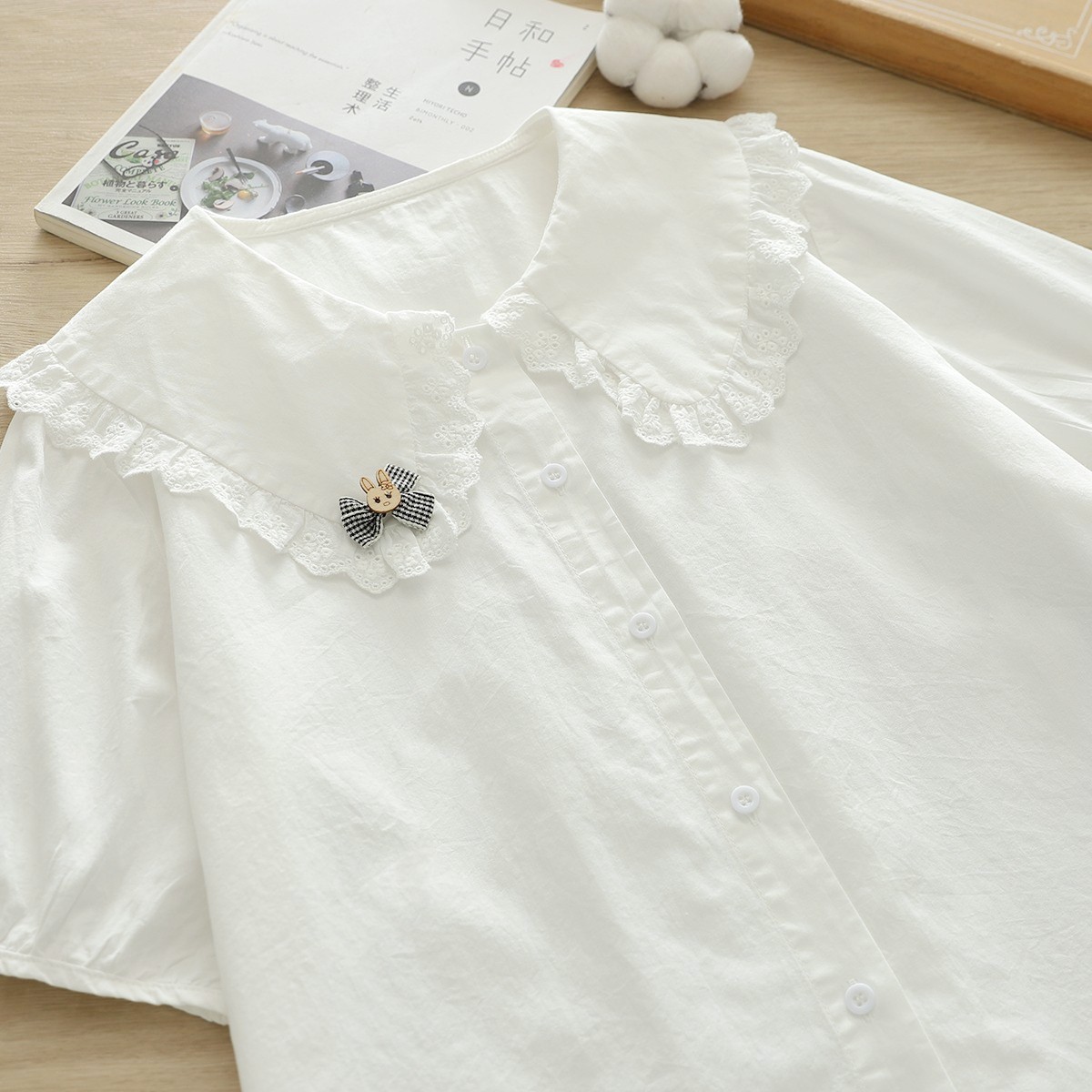 2025夏季文艺小清新立体蝴蝶结兔子蕾丝花边娃娃领白衬衫女短袖潮