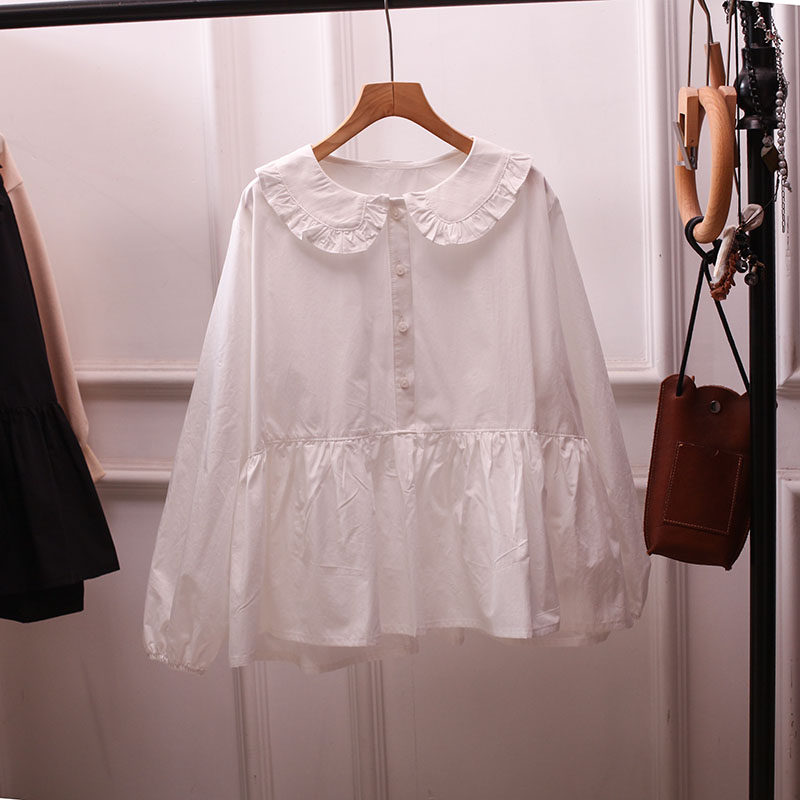 日系复古娃娃领白衬衫女长袖荷叶边显瘦百搭文艺上衣宽松大码胖mm