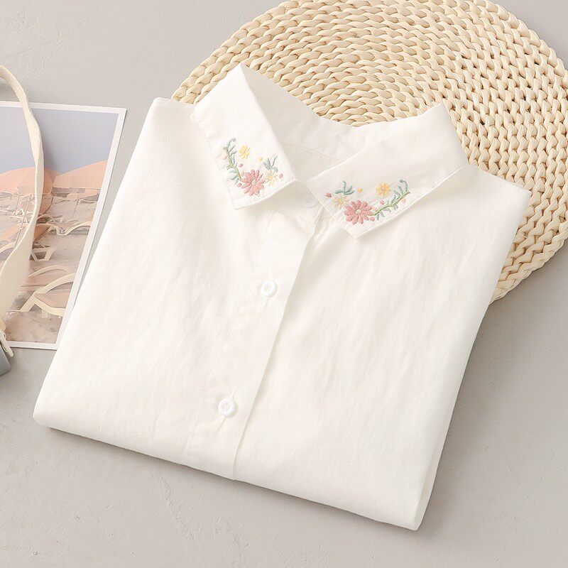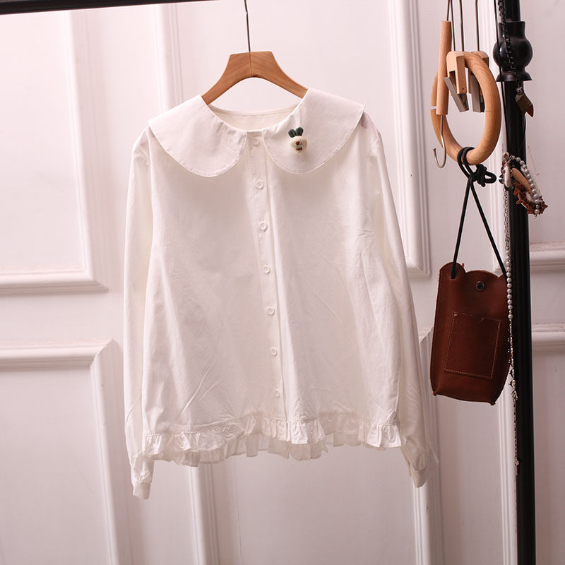 日系文艺小清新刺绣花朵宽松全棉娃娃领白衬衫女长袖打底衫学生潮