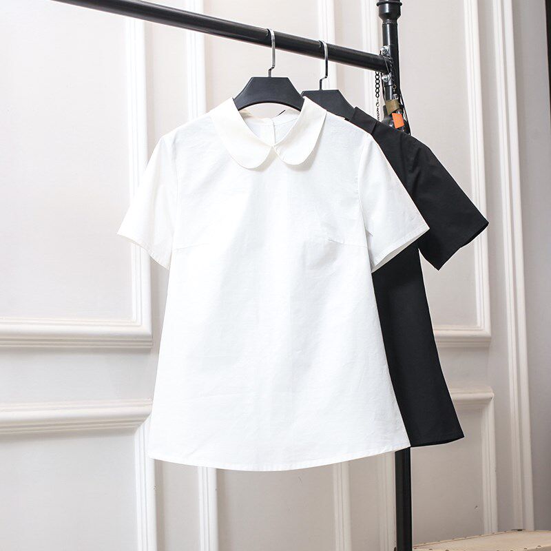 日系百搭娃娃领白衬衫女大码宽松设计感百搭森系小清新黑色法式胖