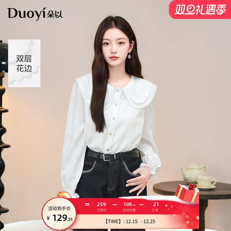 朵以2025冬季新款甜美温柔少女感学院风减龄通勤花边娃娃领白衬衫