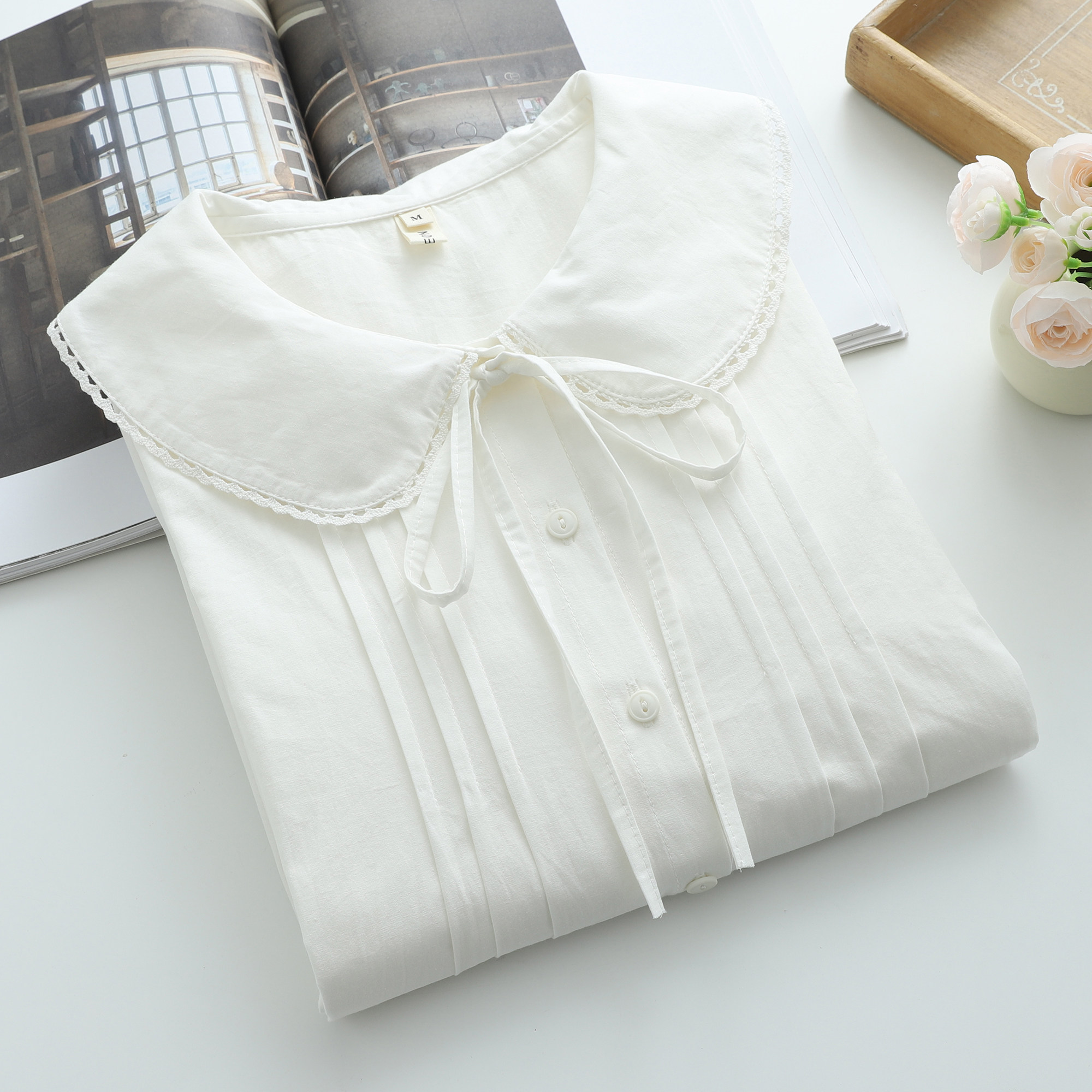 日系软妹森女系小清新风琴压褶宽松纯棉布长袖娃娃领白衬衫上衣女