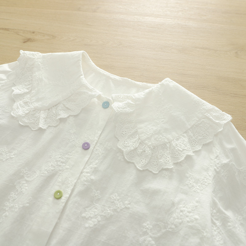 经典 温柔文艺风刺绣花朵娃娃领白衬衫女长袖纯棉百搭衬衣MAC45