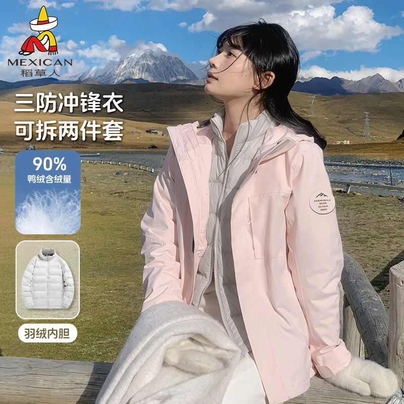 稻草人冲锋衣女生羽绒外套2025新款秋冬三合一防风防水滑雪登山服
