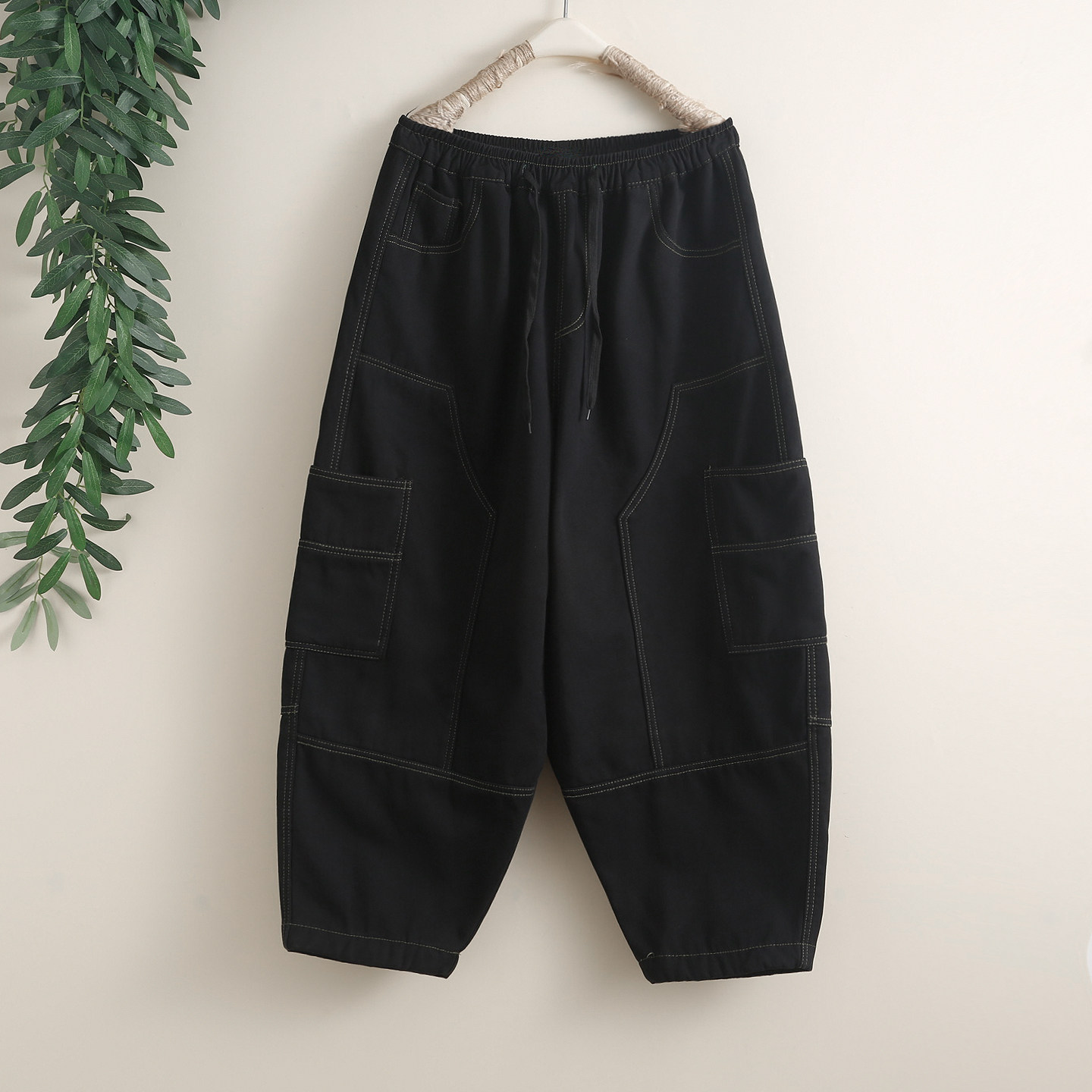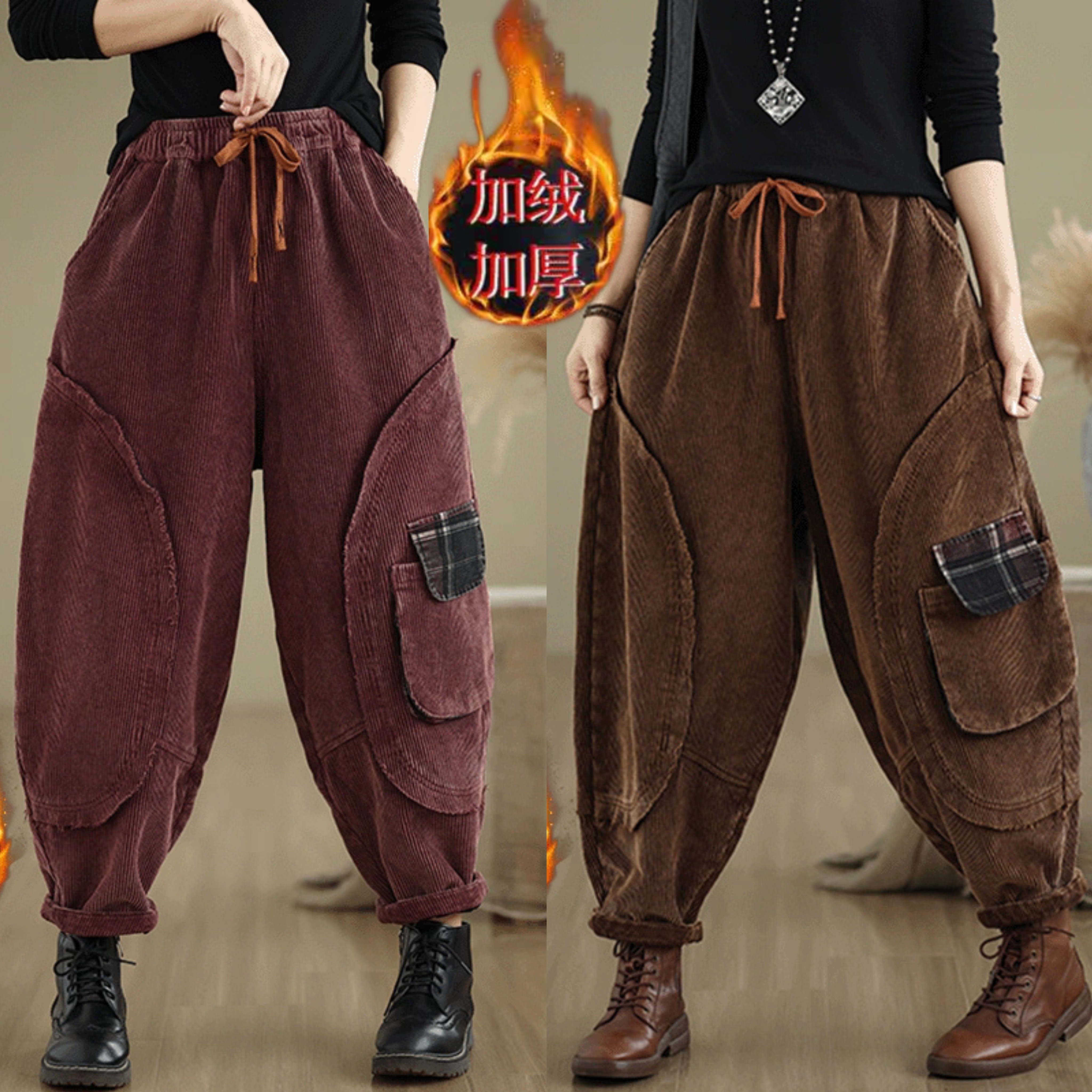 时尚明线拼接加绒加厚牛仔裤女宽松休闲潮流大口袋保暖工装哈伦裤