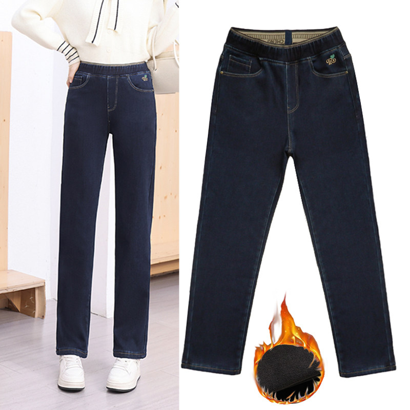 加绒加厚牛仔裤女宽松直筒裤子中年妈妈松紧高腰保暖弹力显瘦长裤