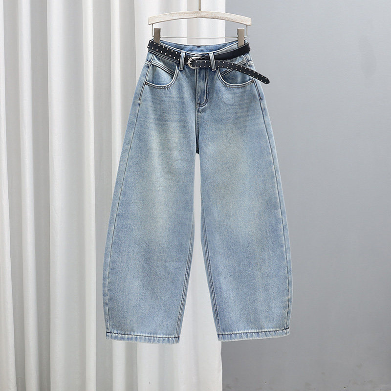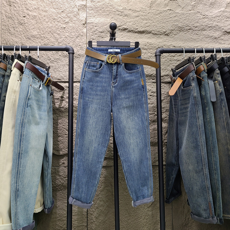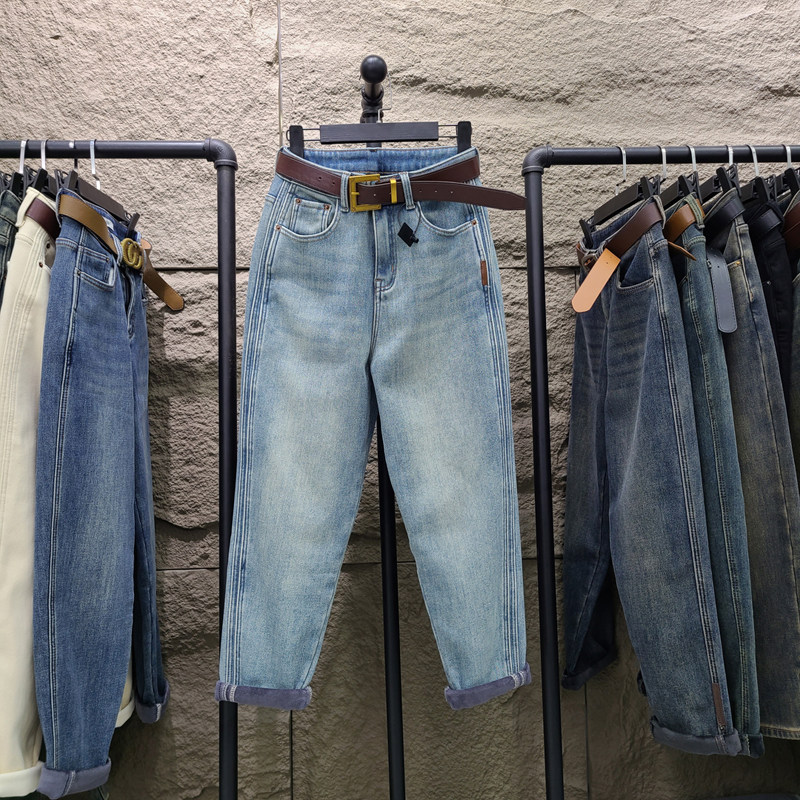 2025冬季新款复古水洗做旧加绒加厚牛仔裤女宽松显瘦百搭哈伦裤潮