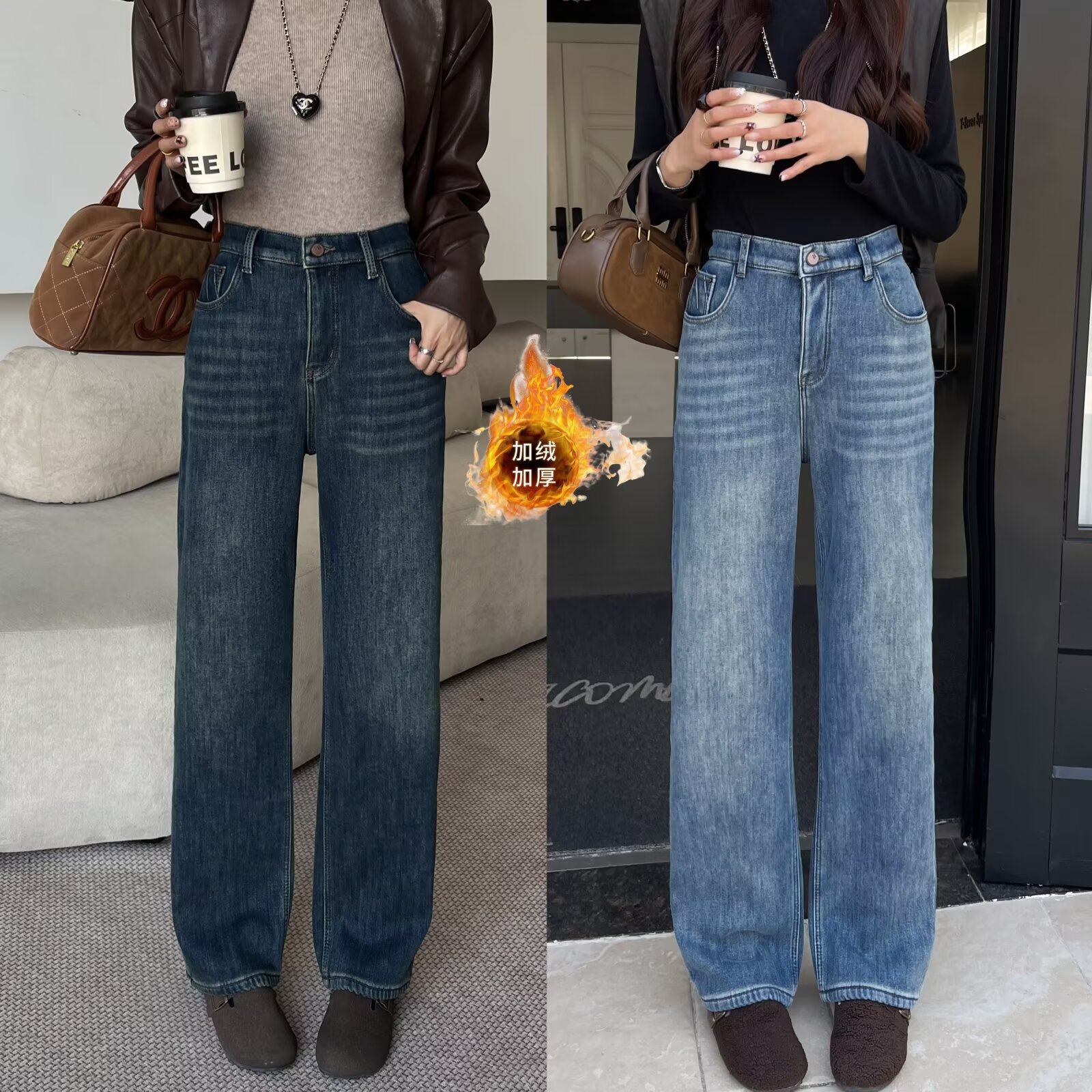 2025百搭加绒加厚牛仔裤女宽松显瘦秋冬季新款女士直筒阔腿裤子女