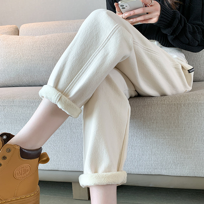米白色加绒加厚牛仔裤女宽松显瘦2024年秋冬高腰萝卜哈伦老爹裤子