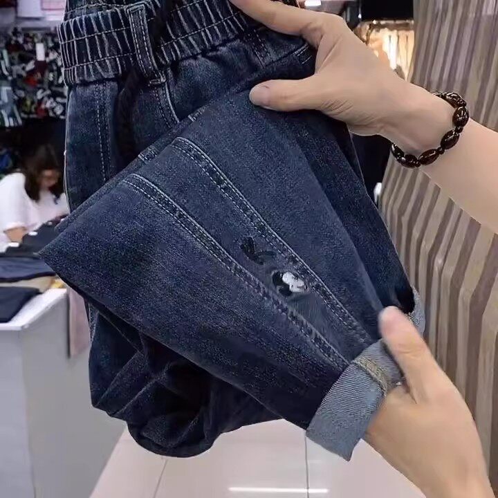 2025年秋冬新款加绒加厚牛仔裤女宽松大码复古松紧腰休闲裤哈伦裤