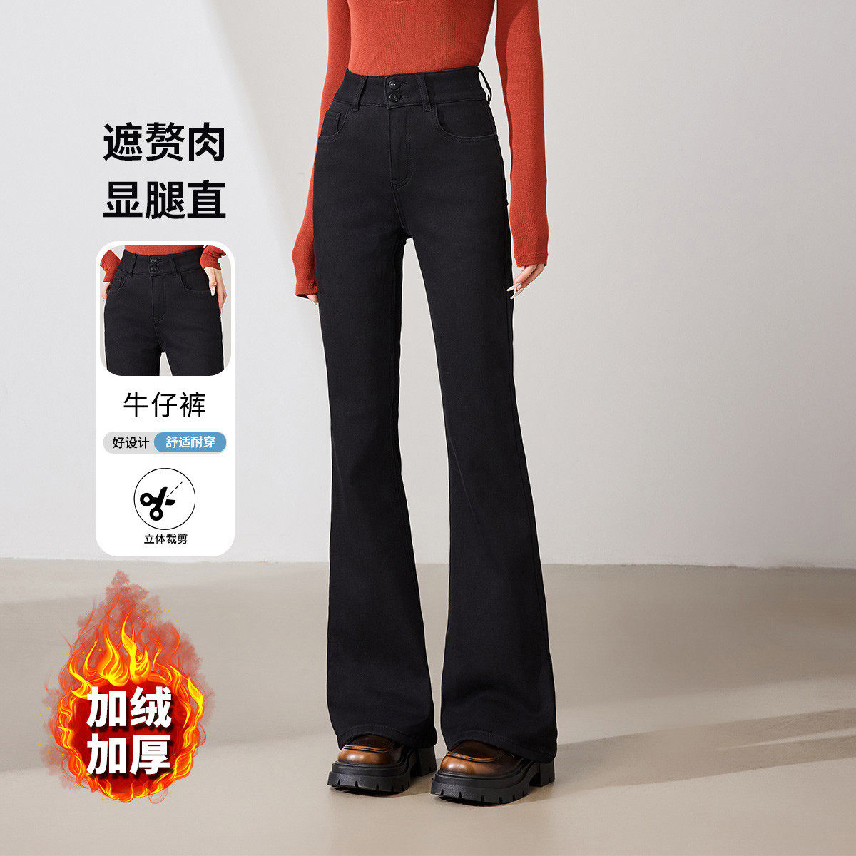 茵曼2025冬季新款加绒加厚牛仔裤女宽松显瘦高腰微喇时尚休闲长裤