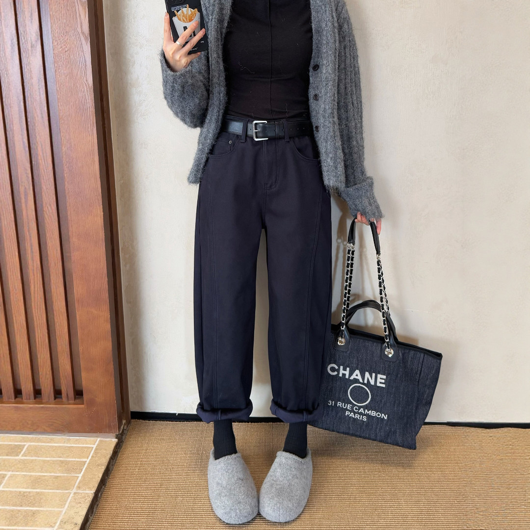 2025年秋冬新款慵懒松弛感深蓝色加绒加厚牛仔裤女宽松显瘦直筒裤