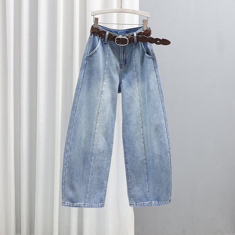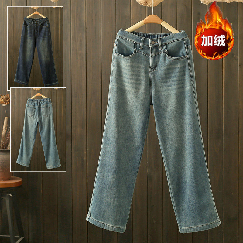 大码女装胖mm复古水洗阔腿加绒加厚牛仔裤女宽松显瘦百搭直筒长裤