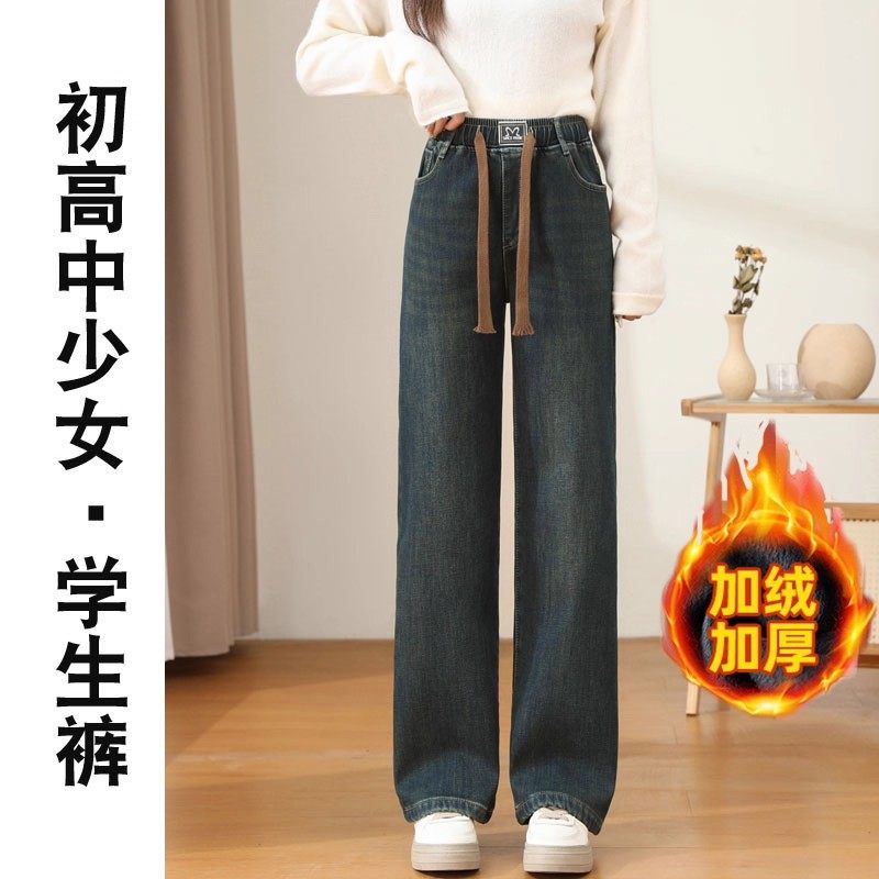 女童牛仔裤加绒裤子秋冬季加厚中大童洋气时髦女孩冬装宽松阔腿裤