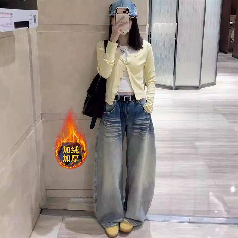 JIUJIU美式复古加绒加厚牛仔裤女宽松冬季2025新款显瘦阔腿裤长裤