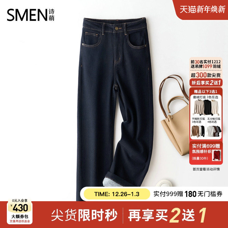 【商场同款】Smen诗萌2025冬季加绒加厚牛仔裤女宽松直筒阔腿裤