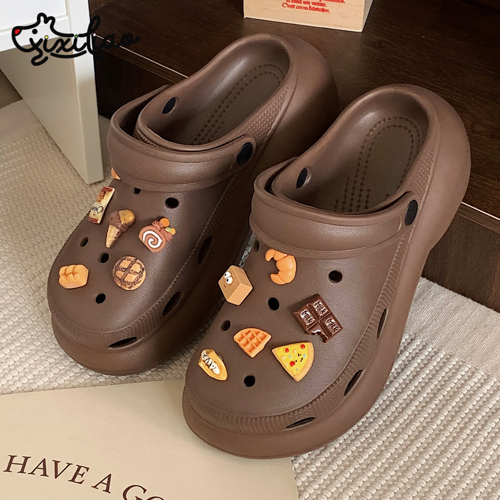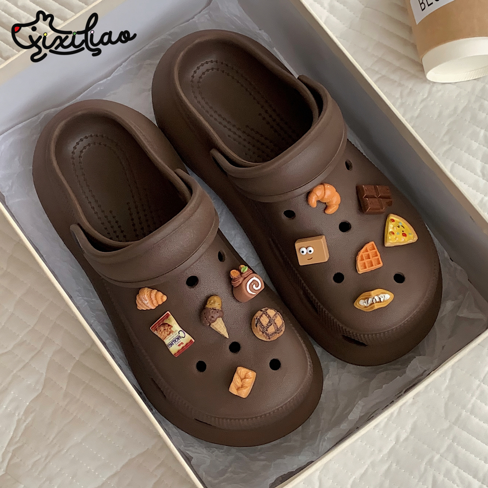 细细条 创意diy披萨巧克力配饰洞洞鞋女夏季拿铁色趣味包头凉拖鞋