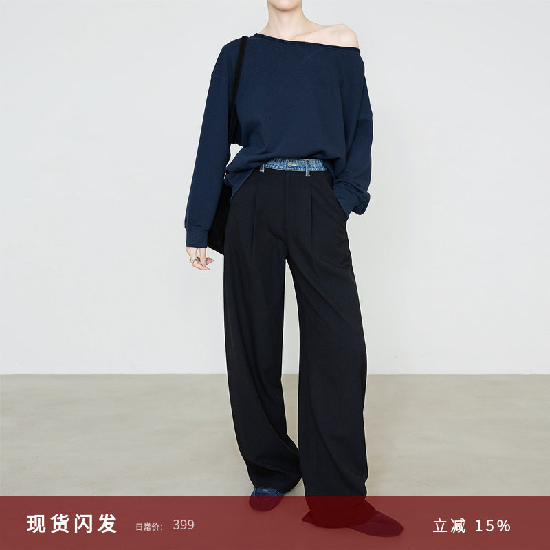 夏莫卡黑色阔腿裤女秋新款小众设计师款牛仔腰天丝羊毛直筒裤6830