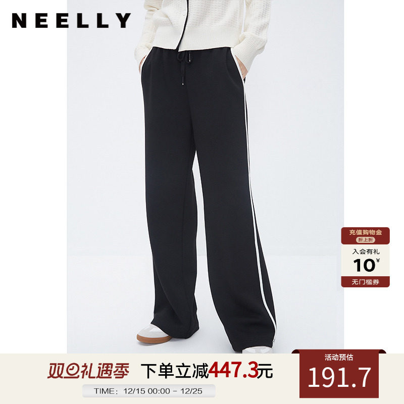 NEELLY纳俪商场同款秋冬黑色阔腿裤卫裤侧条纹直筒显瘦休闲运动裤