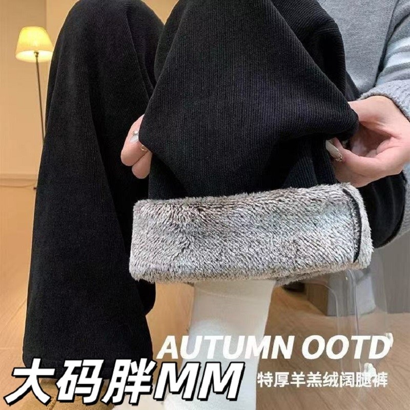 大码加绒黑色阔腿裤女秋冬高腰垂感直筒雪尼尔羊羔绒加厚保暖棉裤