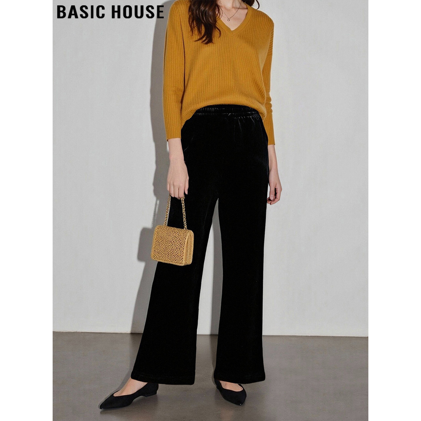 Basic House/百家好金丝绒黑色阔腿裤女2025冬季加厚松紧腰直筒裤