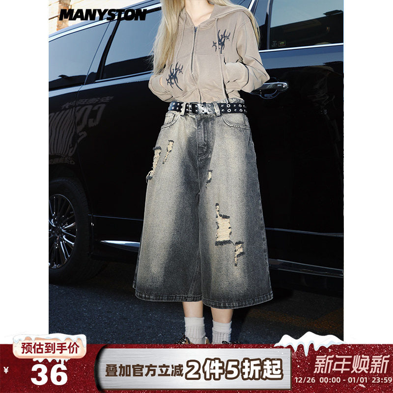 清仓MANYSTON美式高街七分牛仔裤男款夏季黑色阔腿裤子直筒休闲裤