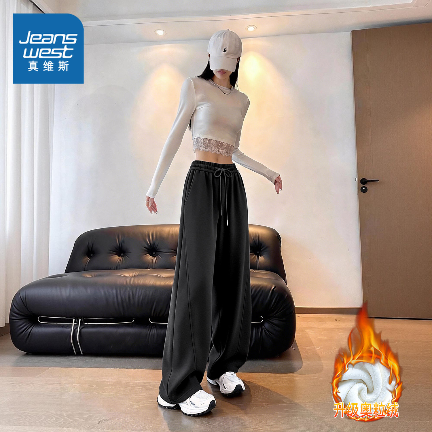 NOB真维斯黑色阔腿裤女2025秋冬新款高腰加绒直筒香蕉弯刀运动裤