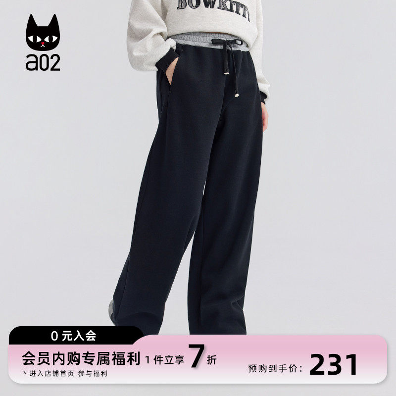 a02宽松加绒休闲裤女2025新款冬季加厚保暖黑色阔腿裤撞色裤子