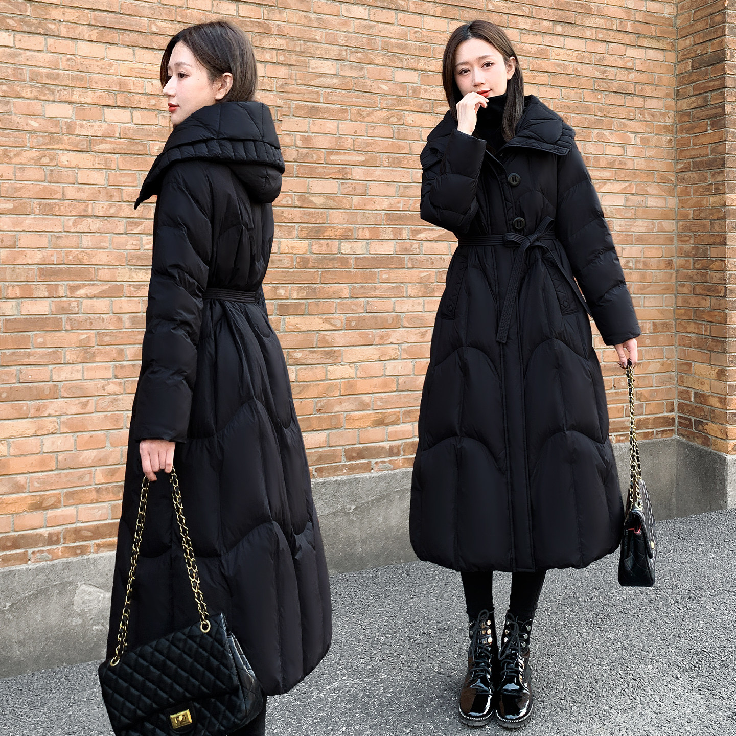 2025年冬季新款女装长款羽绒服女修身黑色过膝连帽白鸭绒外套加厚