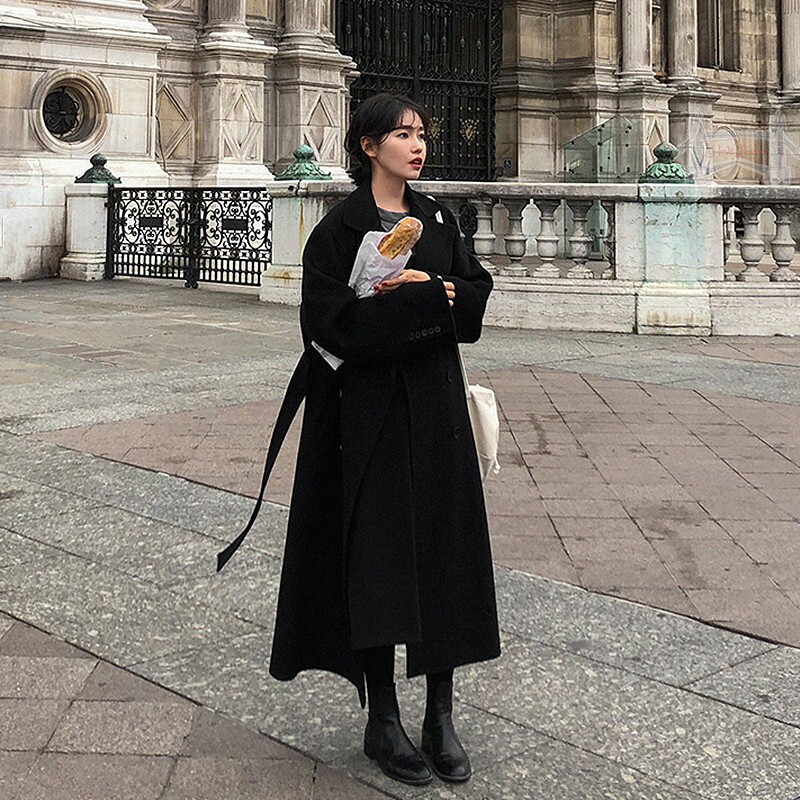 韩版宽松毛呢外套女超长赫本风学生简约秋冬加厚黑色新款呢子大衣