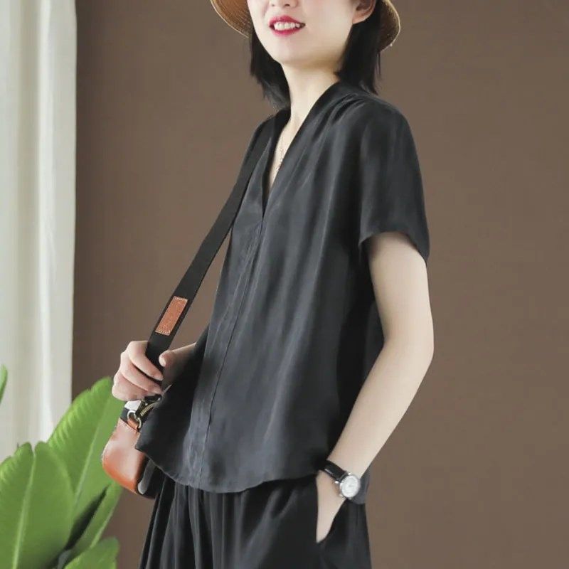 铜氨丝短袖T恤黑色垂感宽松Vx领大码女装夏季新款文艺复古纯色上