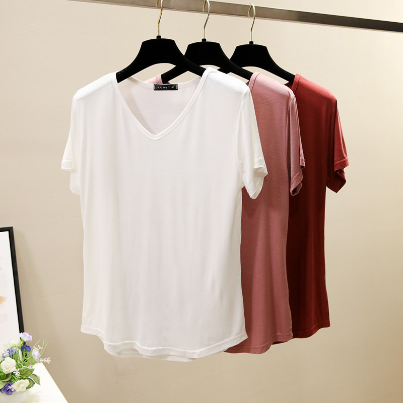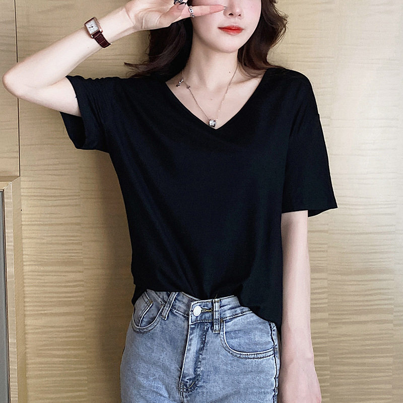 黑色莫代尔棉宽松V领短袖T恤女夏季新款纯色休闲简约打底体恤薄款