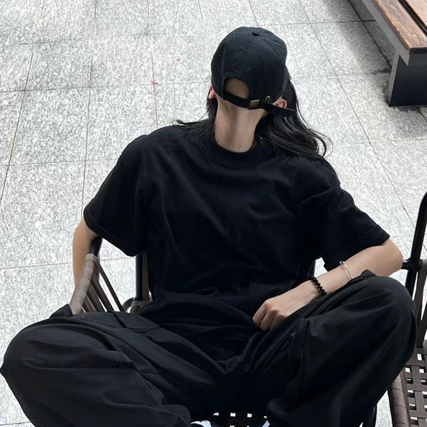 350G纯棉2025夏季宽松黑色短袖T恤男女百搭圆领纯色港风休闲半袖
