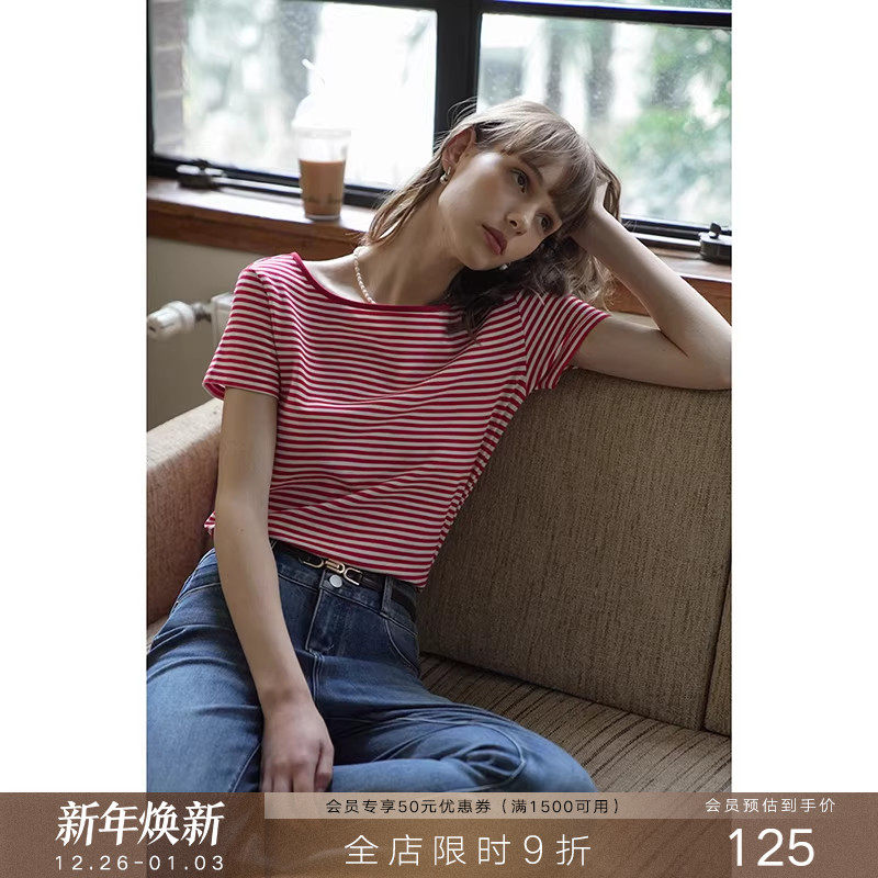 popchrio◆圆领黑色条纹一字领宽松短袖T恤法式纯色简约上衣女夏