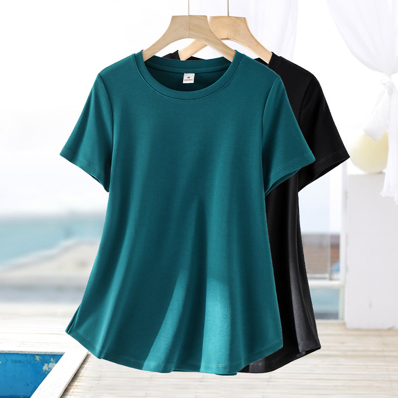 莫代尔圆领T恤女短袖夏季宽松薄款上衣黑色白百搭纯色大码打底衫