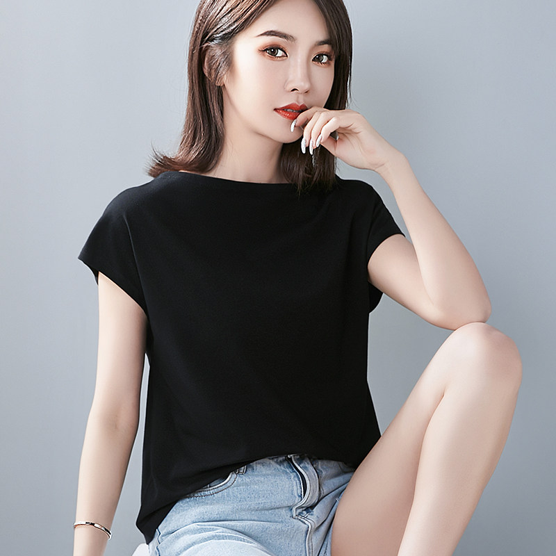 黑色宽松精梳棉一字领连肩袖短袖t恤女夏季新款纯色百搭打底体恤
