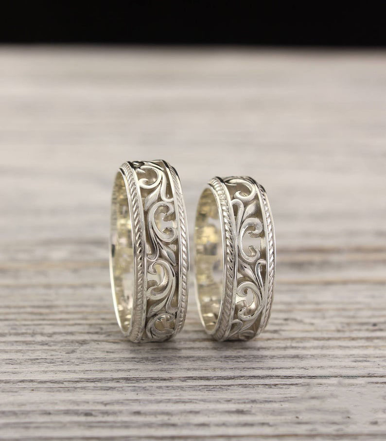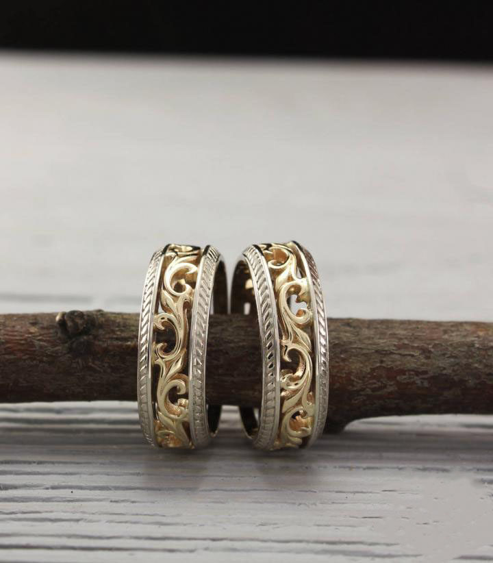 乌克兰代购Wedding◇手作复古简约花纹14K金纯银情侣对戒订婚戒指