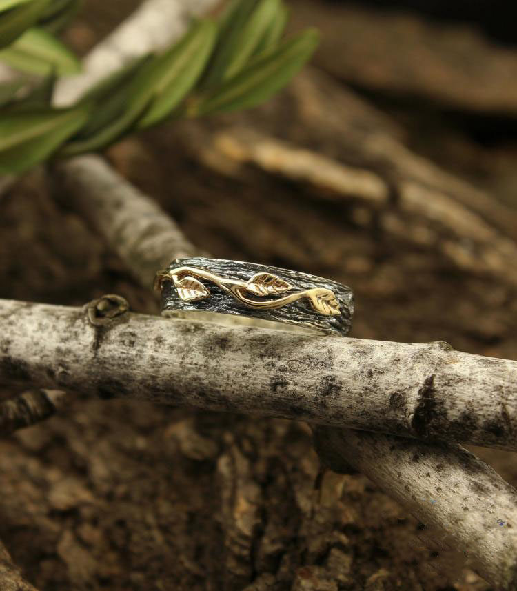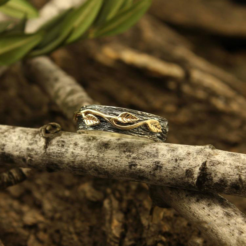 海外代购Tree◇手作复古自然枝叶树皮纯银14K金叶子雕刻情侣戒指