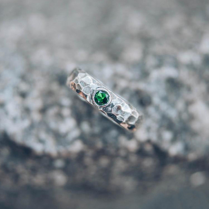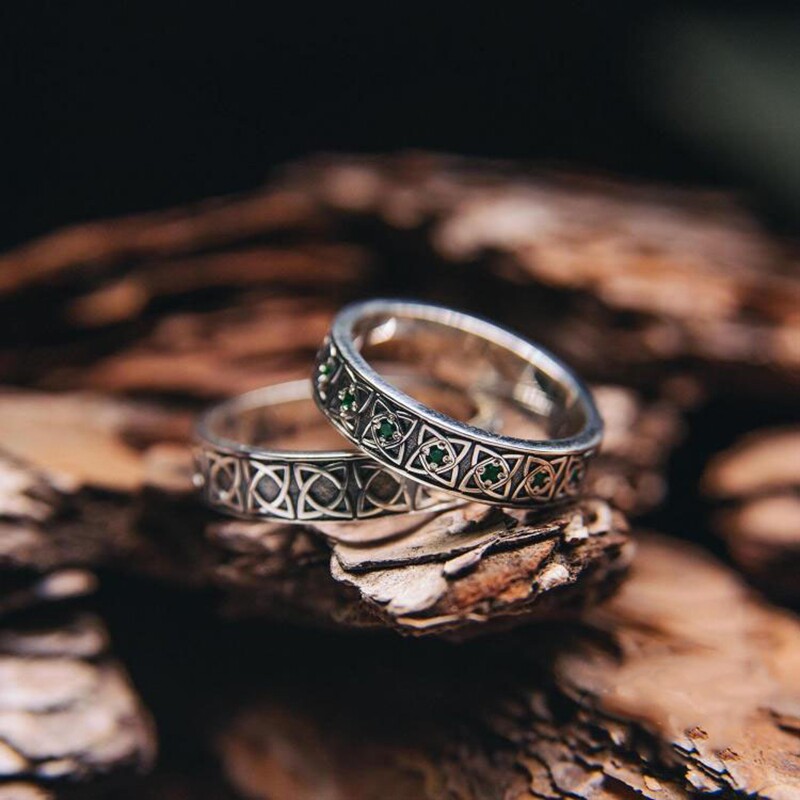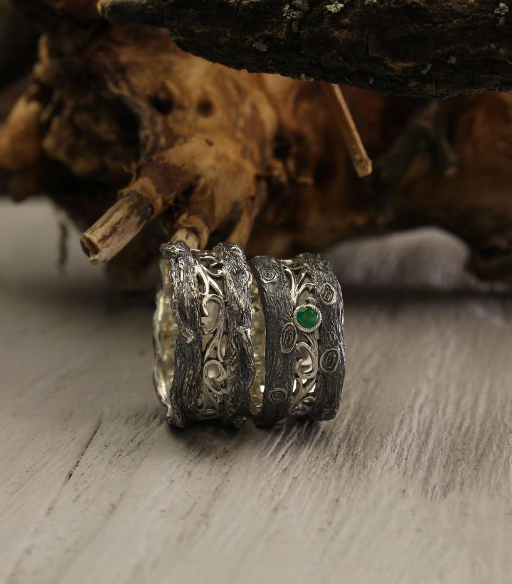 乌克兰代购Tree◇手作复古树木年轮天然祖母绿纯银情侣对戒戒指