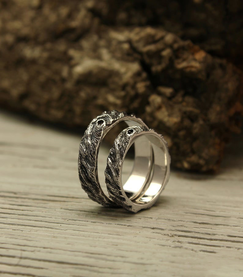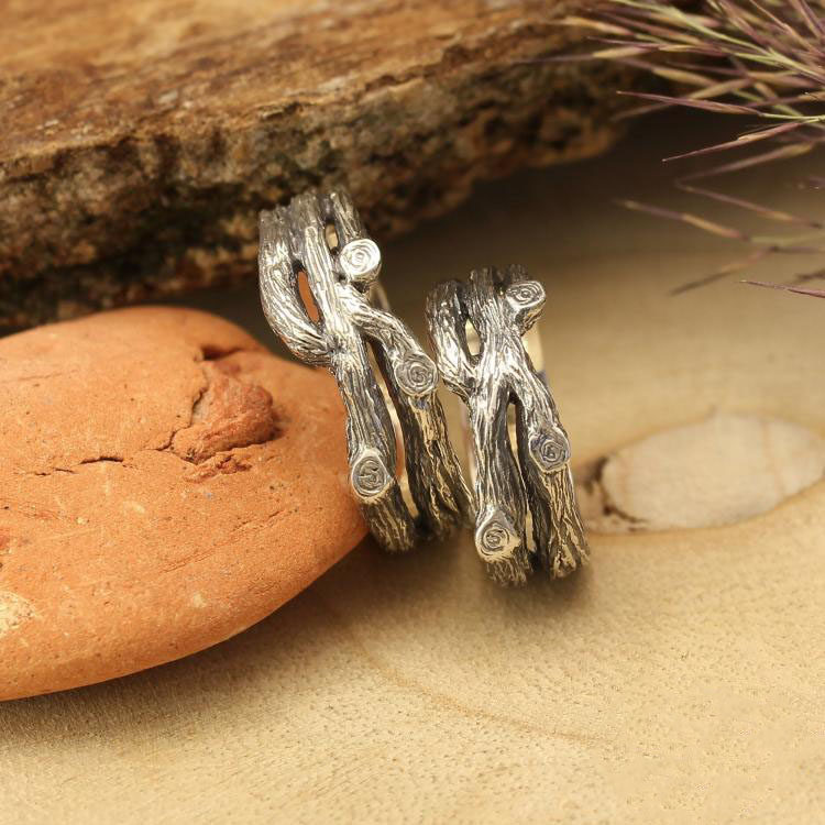 乌克兰代购Tree◇手作森林自然树皮纹理纯银情侣结婚对戒套装戒指